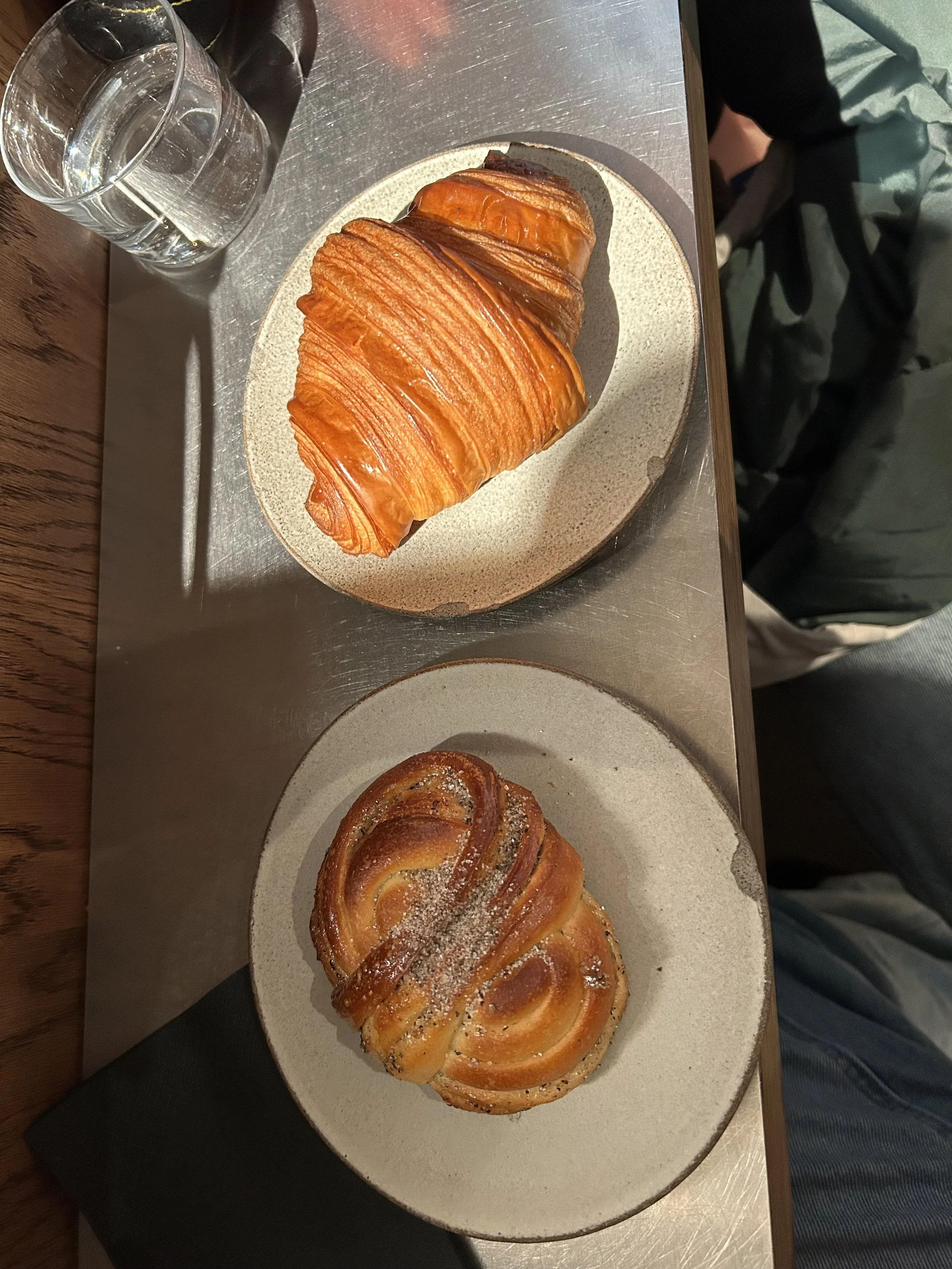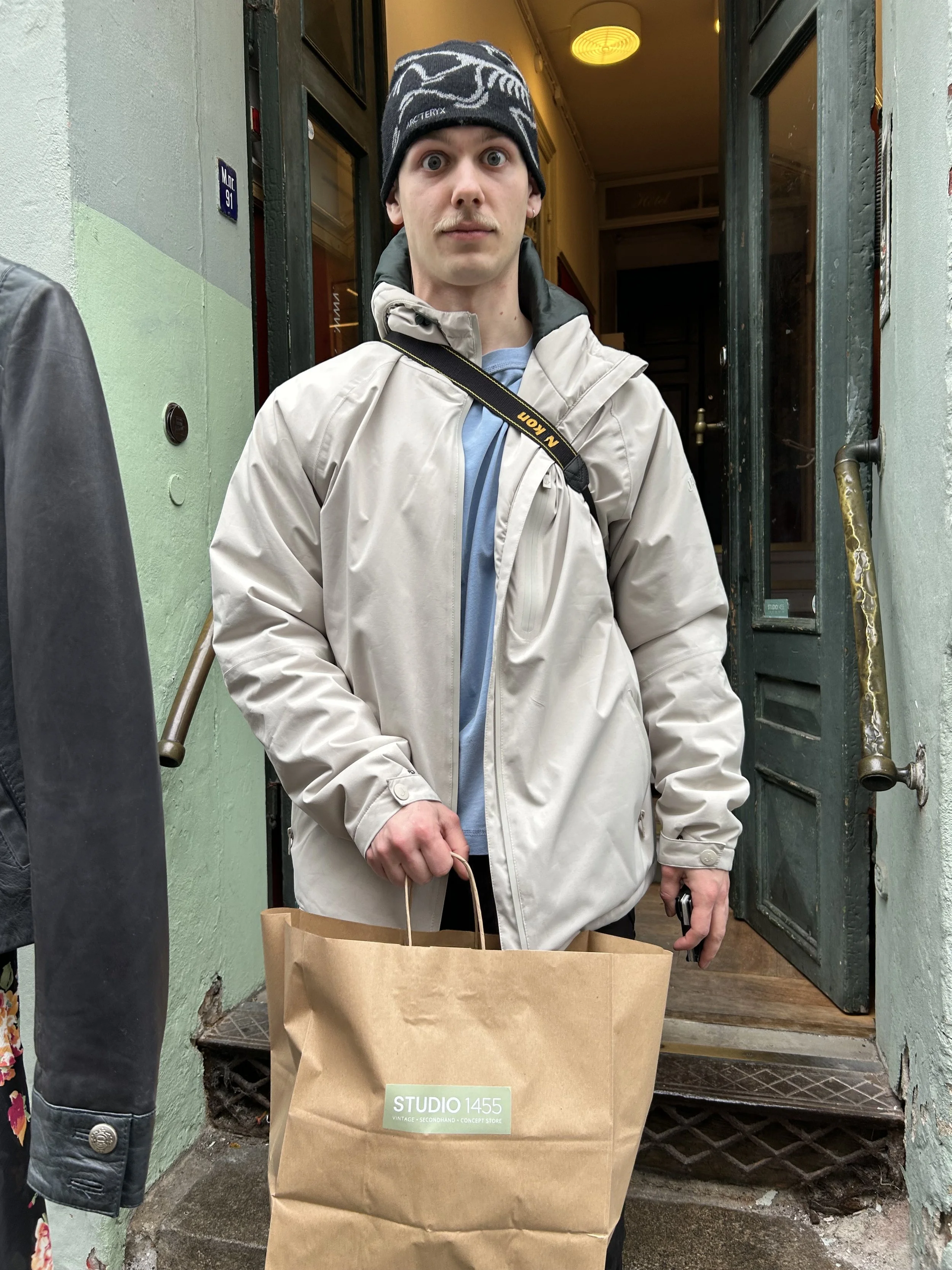 So far, we have started every morning with a cardamom bun or croissant and coffee before heading out! Conner found his favorite store ever in Copenhagen. It is called Grocery and it has all things tech wear and gorp-core esque. The sneakers he is wearing we found at a different store called Lagune, but they did not accept Amex so we had to leave them behind, but they randomly had them at Grocery and for half off!!! Wohoooo! There was a big sale, so Conner was able to grab the blue and brown long-sleeve and these sick plum-colored pants. If that store couldn’t have made Conner any happier, they sold chalk bags (for rock climbing) that are handmade in Copenhagen with deadstock fabrics and scraps of climbing ropes (this really won over my sustainable fashion-loving heart). To make it even better, it is a one-of-one piece that wasn’t even on the showroom floor yet.